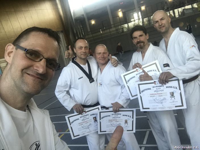 Alle 4 Sportler stellten sich nach vielen Jahren Training der Prüfung, deren erfolgreicher Abschluss für einen Kampfsportler das größte Ziel aber gleichzeitig auch die größte Herausforderung ist - die DAN-Prüfung. Alle vier zeigten während der 5-stündigen Prüfung große Willenskraft, Durchhaltevermögen und insgesamt tolle Leistungen. Der Lohn für die vielen Monate der intensiven Vorbereitung ist nun für Maik, Andreas und Jörg der lang ersehnte.Schwarze Gürtel - der 1.DAN.