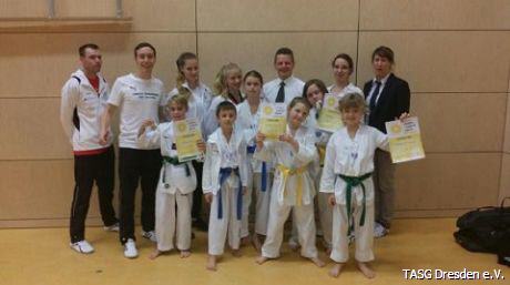 Dabei zeigten Nele, Alex, Sabine, Lilly, Charlene und Marcel, welch sportliches Talent in ihnen steckt. Insgesamt nahmen rund 65 Kinder an dem Sporthighlight der sächsischen Nachwuchssportler teil. Unterstützt von Linda, Lea, Enrico, Tobi, Lisa, Claudi und Jens konnten wiedereinmal alle ganz stolz auf ihre Leistung sein. Sabine und Charlene sicherten sich im Vielseitigkeitswettbewerb in ihrer Klasse jeweils Platz 1 und 2. Ebenfalls Gold gewann Alex. Neben Charlene, startete auch Lilly das erste Mal bei einem Turnier und sicherte sich einen starken 3. Platz. Nele gewann im Formenlauf mit guten Formenläufen die Silber - Medaille. Auch Marcel gewann nach einer ganz starken Leistung Silber im Formenlauf.